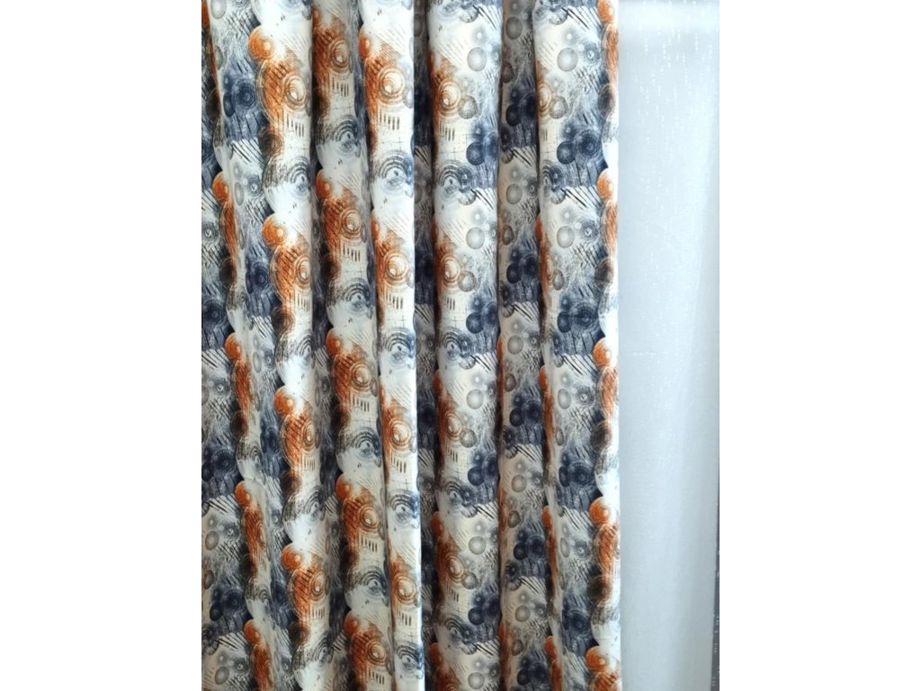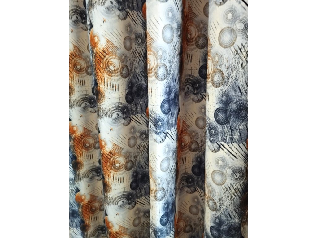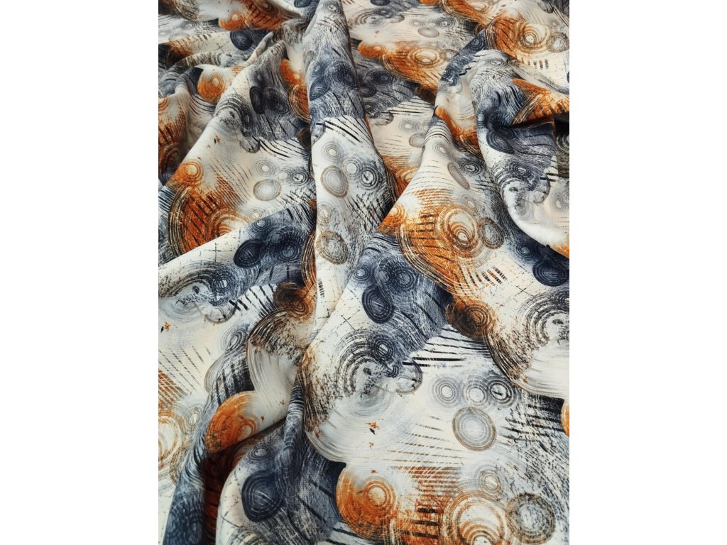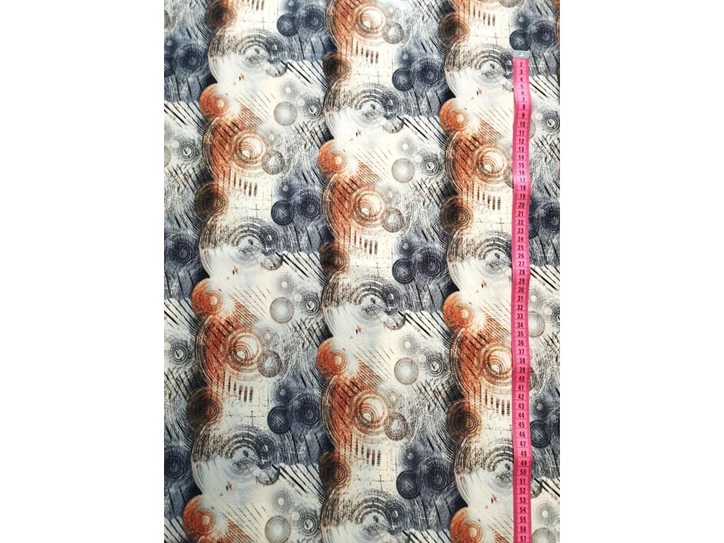 Abstraktní vzor připomíná víření kruhů nebo bublinek. Tlumené tóny tmavě šedé, rezavé a béžové dodávají klidný, ale výrazově bohatý charakter.