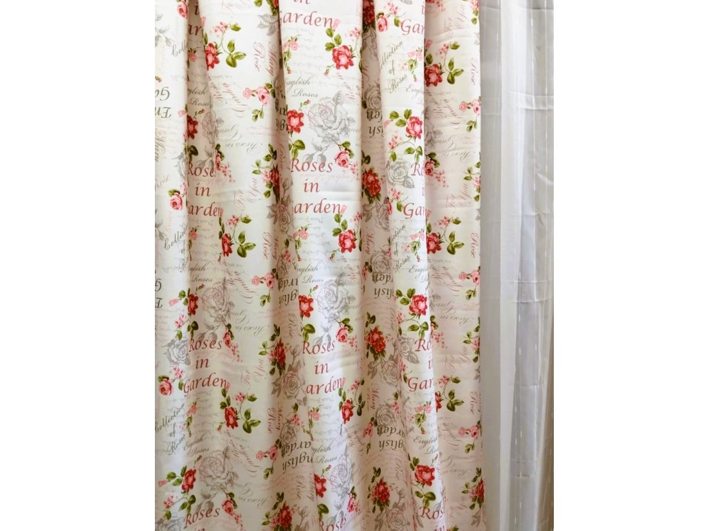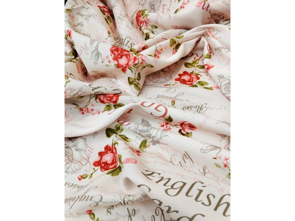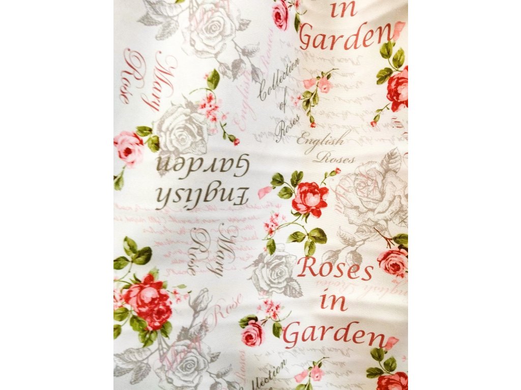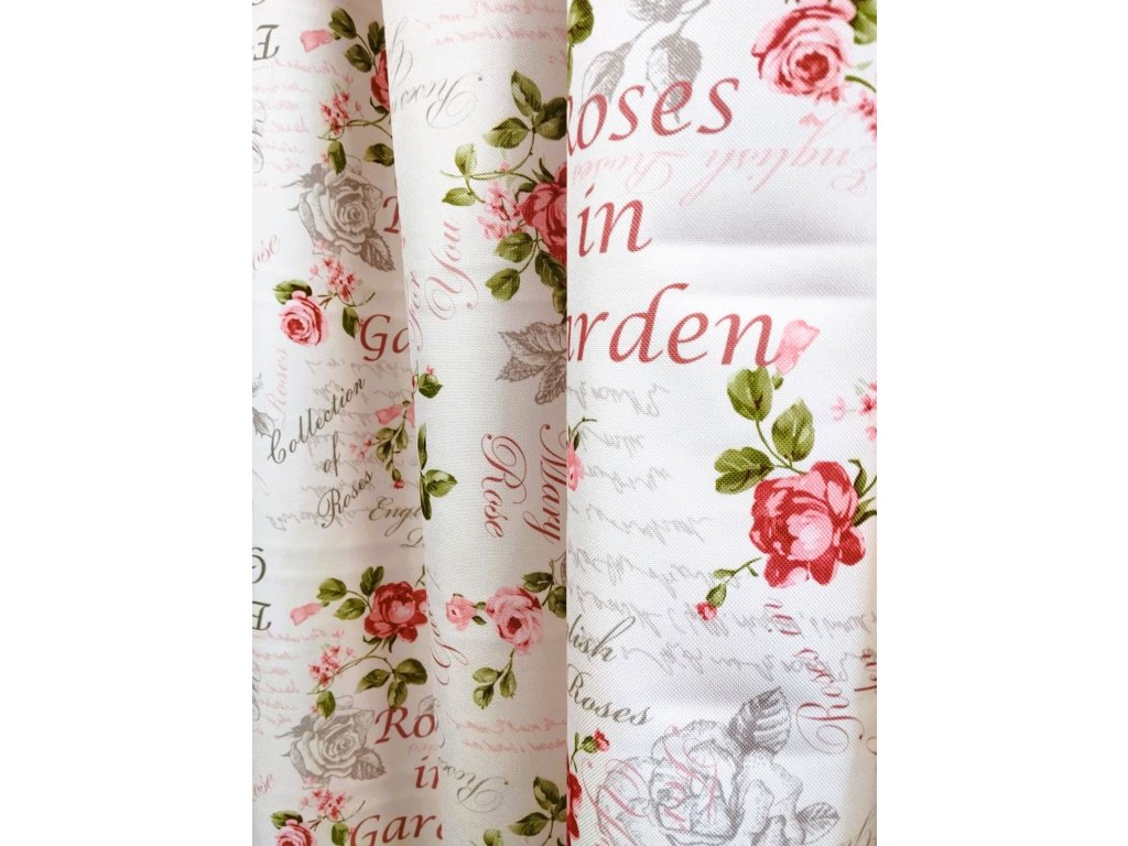 Vzor s růžemi v jemných červenorůžových tonech na sv. režném podkladu, doplněný nápisy působí romanticky a zachycuje atmosféru venkovského stylu.