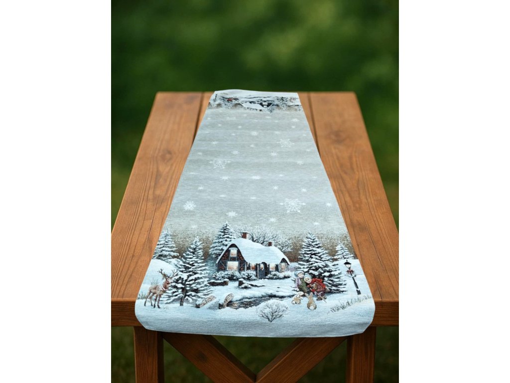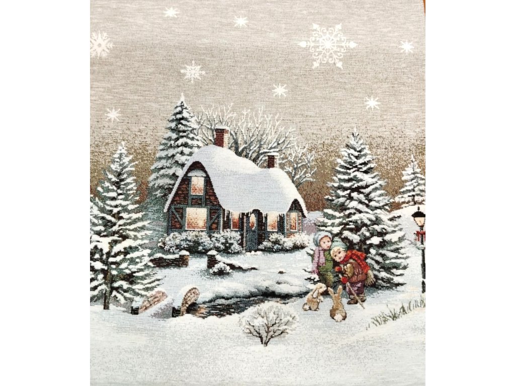 Elegantní běhoun na stůl s motivem chaloupky a dětí